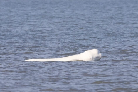 Sinds een paar dagen zwemt er een zeer zeldzame beloega of witte dolfijn voor…