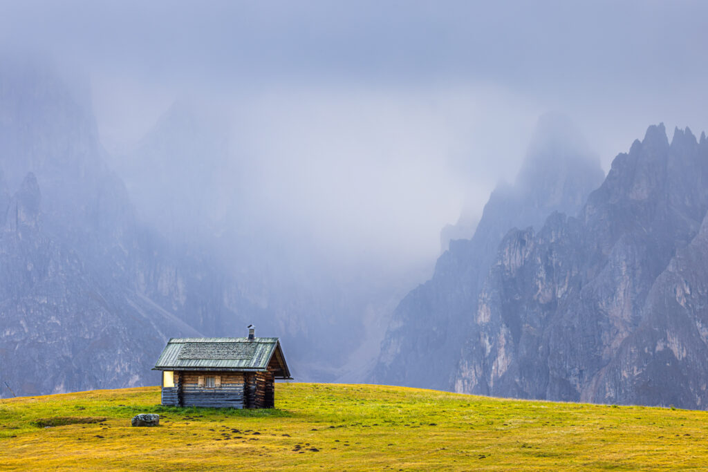 Ai, het is slecht weer. Om toch mooie platen in de bergen te kunnen maken, kun je kiezen voor een opvallende (kleurrijke) voorgrond.