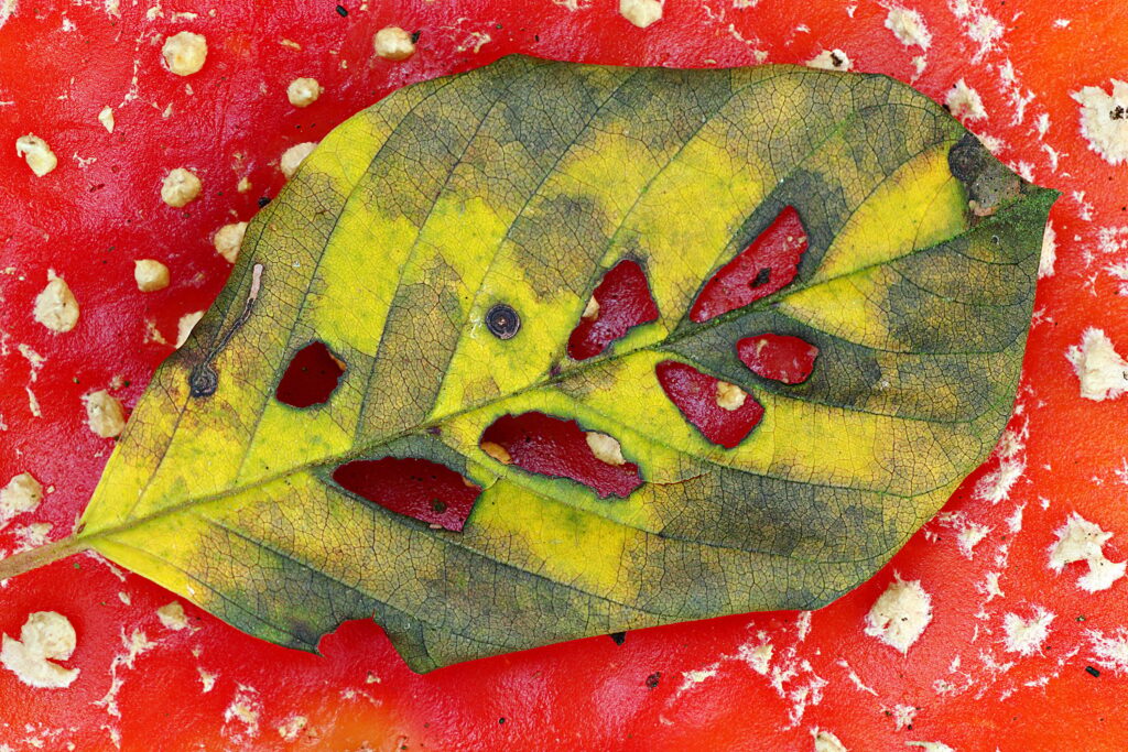 Een opvallend beeld vanwege de contrasten en knalkleuren. De tamelijk eenvoudige compositie biedt een mooi tegenwicht voor de veelheid aan structuren (de stippen, de nerven, de gaatjes).