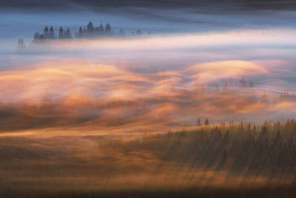 Deze foto is genomen op een koele zomerochtend in het IJzergebergte in Tsjechië. De fotograaf had een hoog uitkijkpunt gekozen. Vlak voor zonsopgang vulde de vallei zich met slierten mist. De mist bewoog constant en het eerste licht creëerde een magisch spel van kleuren en schaduwen.