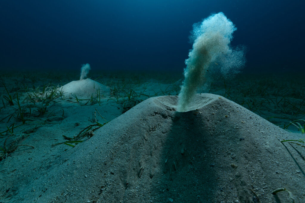 Borstelwormen spoelen zand uit hun holen te midden van een zeegrasveld in het Spaanse Middellandse Zeegebied. De gravende wormen spelen een cruciale rol in het handhaven van de zuurstof- en voedingsstoffencirculatie in de bovenste lagen van het oceaansediment, een volledig verborgen ecosysteem onder de zeebodem. Alle zeegrasvelden aan de kusten van de wereld zijn afhankelijk van het bestaan van deze onbekende wormengemeenschap.