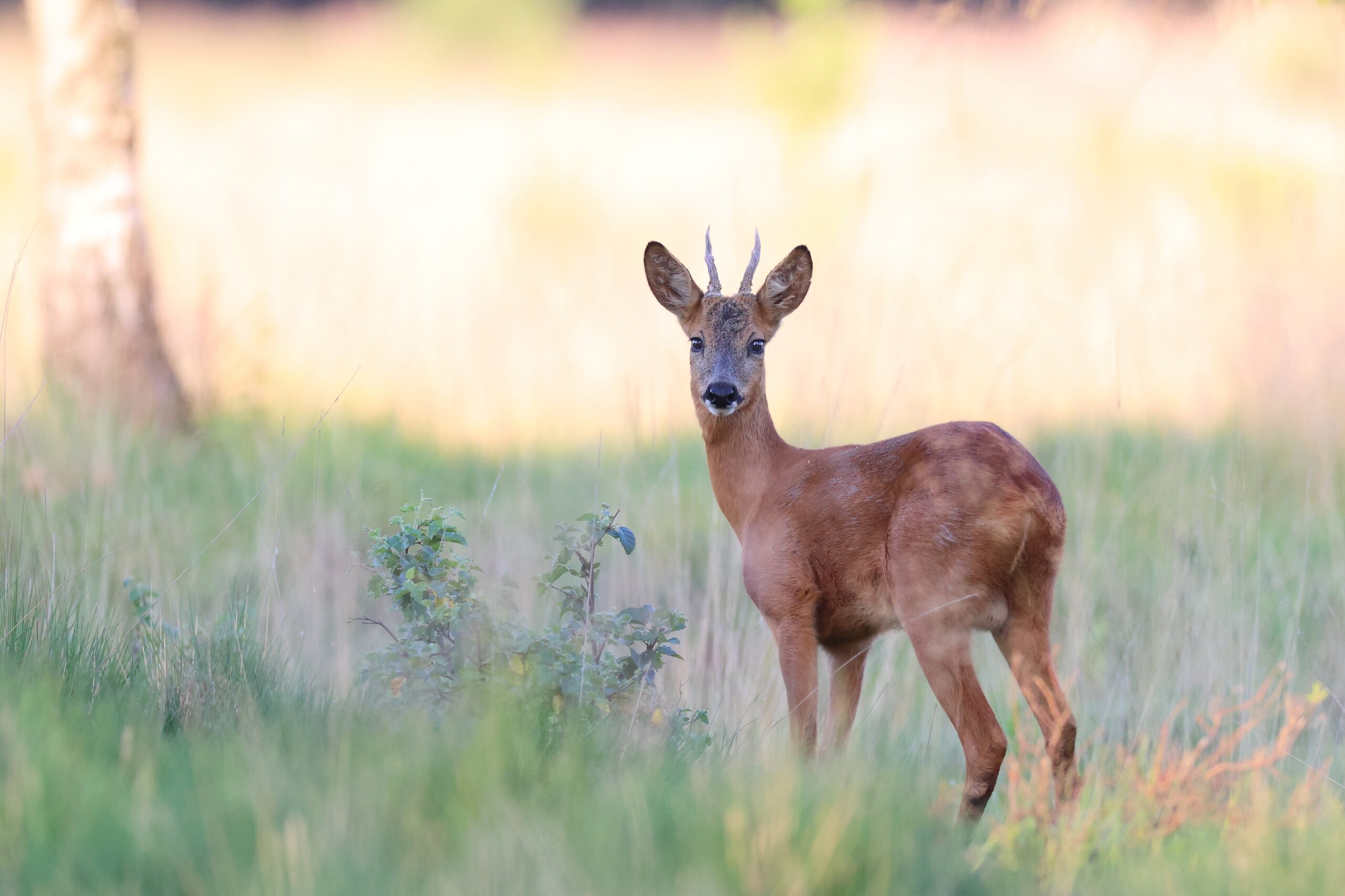 Prima compositie met de struik en het ree die samen het middelpunt vormen.