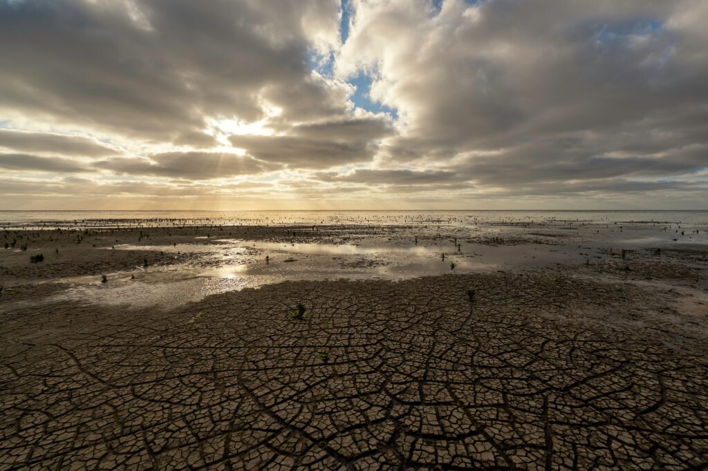 Een fraaie combinatie van structuren: de gescheurde bodem, het water met de planten en daarbij de wolkenlucht.
