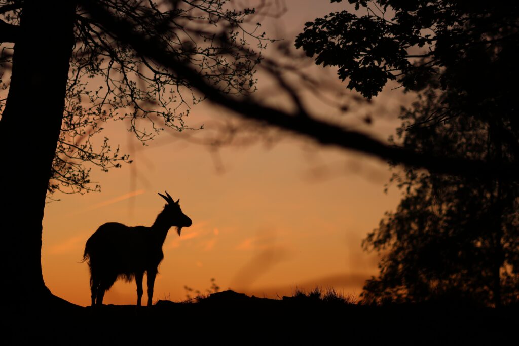 Een opvallende plaat vanwege het lage licht, de omlijsting door de bomen en de geit die precies op de goede plek staat.