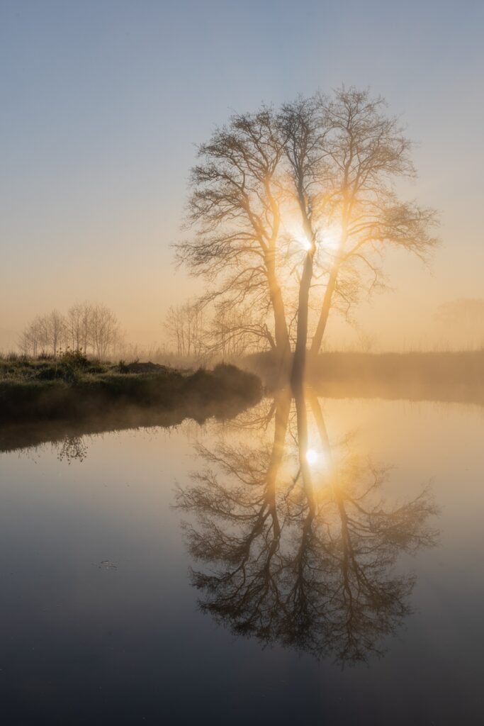 De reflectie in het stille water, de zon die door de takken schijnt en daarnaast de uitgebalanceerde compositie met de boom rechts van het midden, maken deze foto bijzonder.