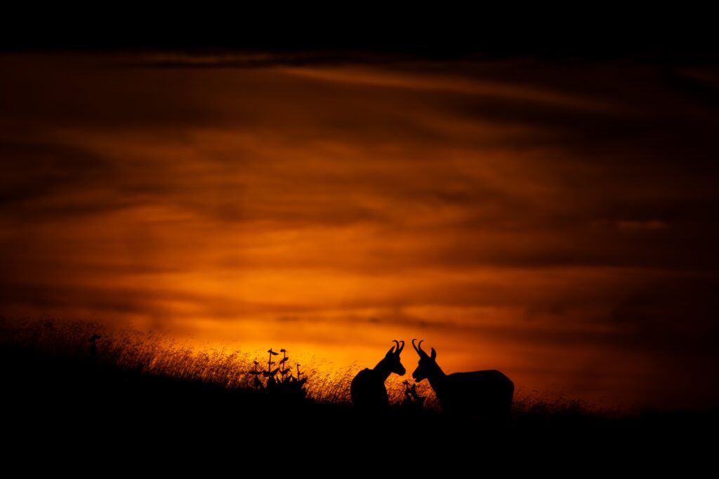 Niet alleen het oranje licht en de fraaie silhouetten van de gemzen maken deze foto bijzonder, ook de communicatie tussen de twee dieren is een grote plus.