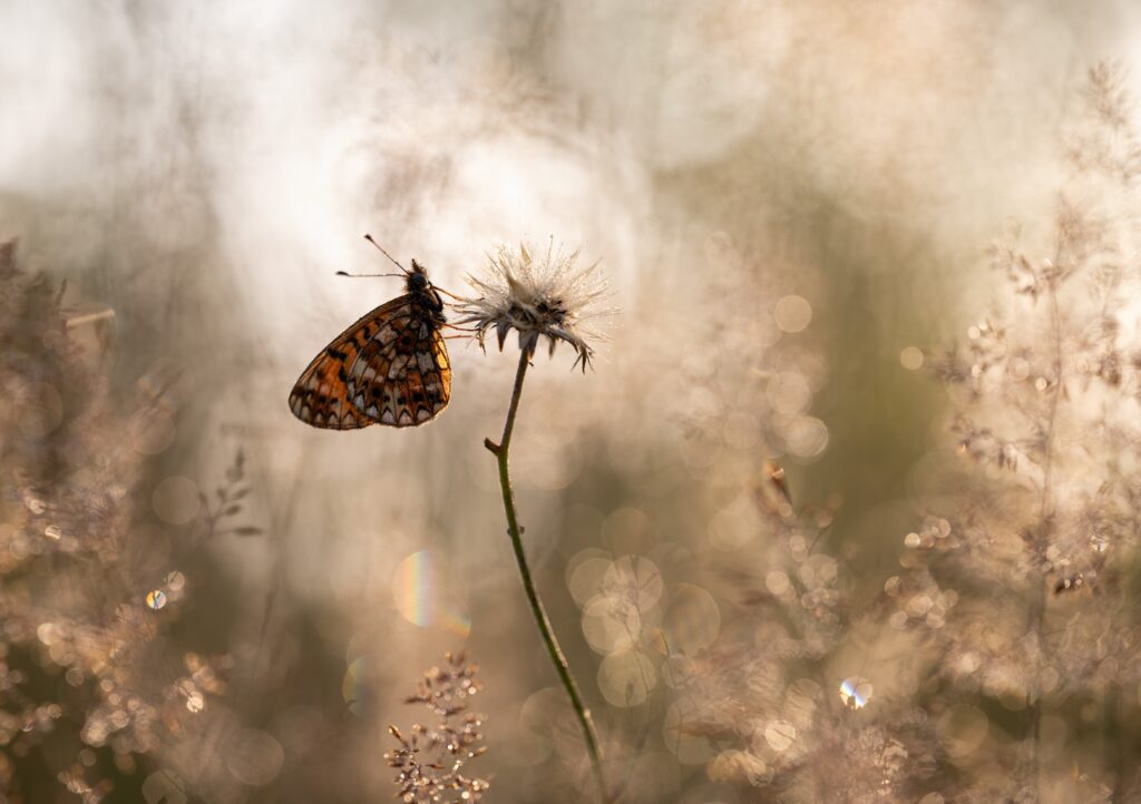 De vroege ochtendsfeer, de dauwdruppels, de bokeh en het licht dat door vleugels schijnt, maken deze foto zeer aantrekkelijk.