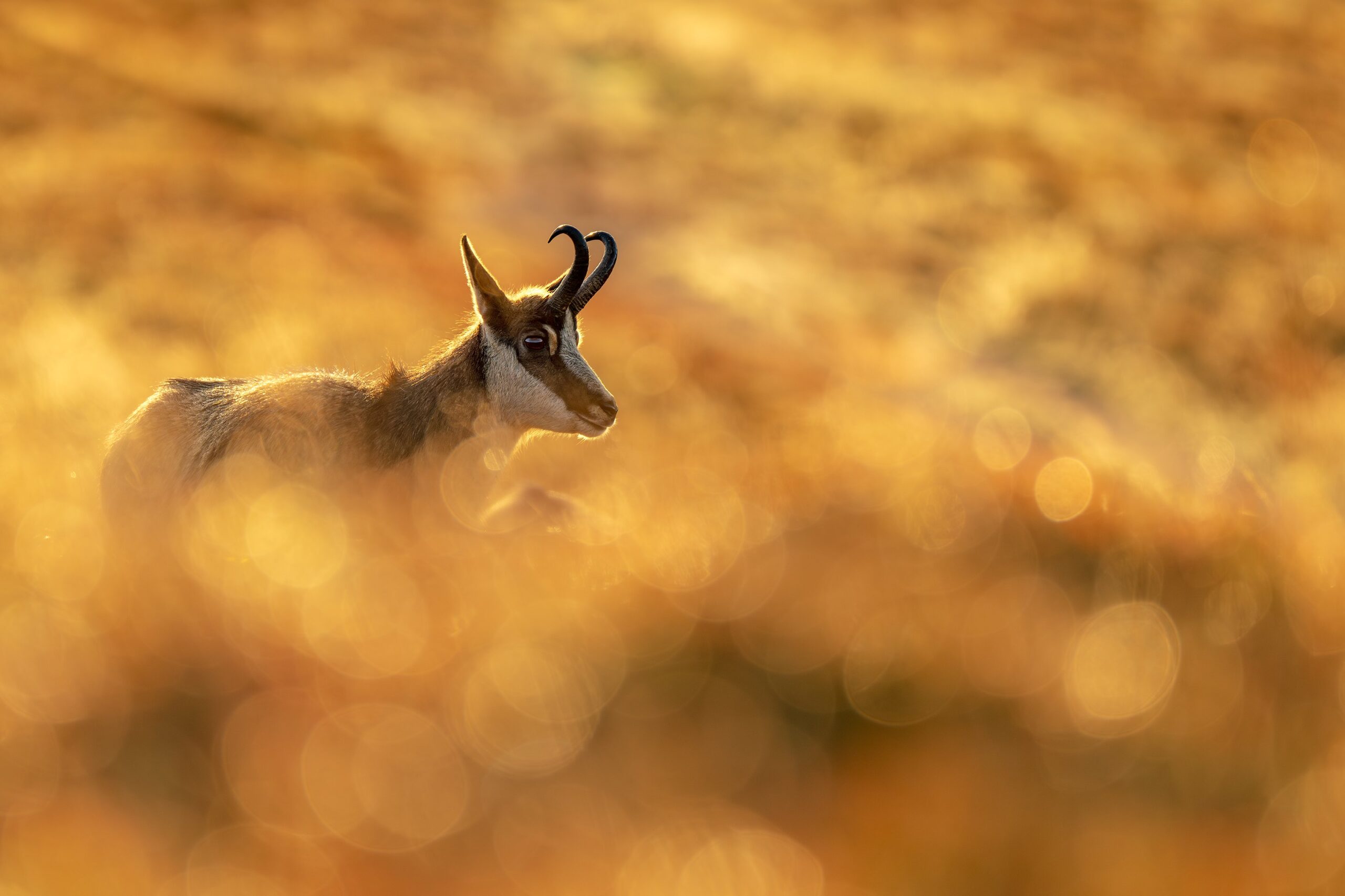 “De foto is gemaakt tijdens een vroege ochtendwandeling in de herfst op de Hohneck in de Vogezen. Een plek die bekend staat, vanwege de gemzen die daar voorkomen. Ze komen daar om in de vroege ochtend, in alle rust, te foerageren. Het was die ochtend nog stil in de bergen, en de zon begon net over de heuvels te kruipen. In het hoge, dorre gras zag ik plots een gems opduiken, prachtig aangelicht door het warme ochtendlicht. Ik ben rustig blijven staan, de camera al klaar maar nog wel even afgewacht hoe de gems op mijn aanwezigheid zou reageren. Gelukkig voelde deze gems zich ongestoord en kon ik wachten totdat het dier zich vanuit mijn standpunt mooi positioneerde. Het licht, de houding van de gems en de sfeer van het moment vielen perfect samen, zeker ook de “bokeh-ballen” door de dauwdruppels op het gras.”