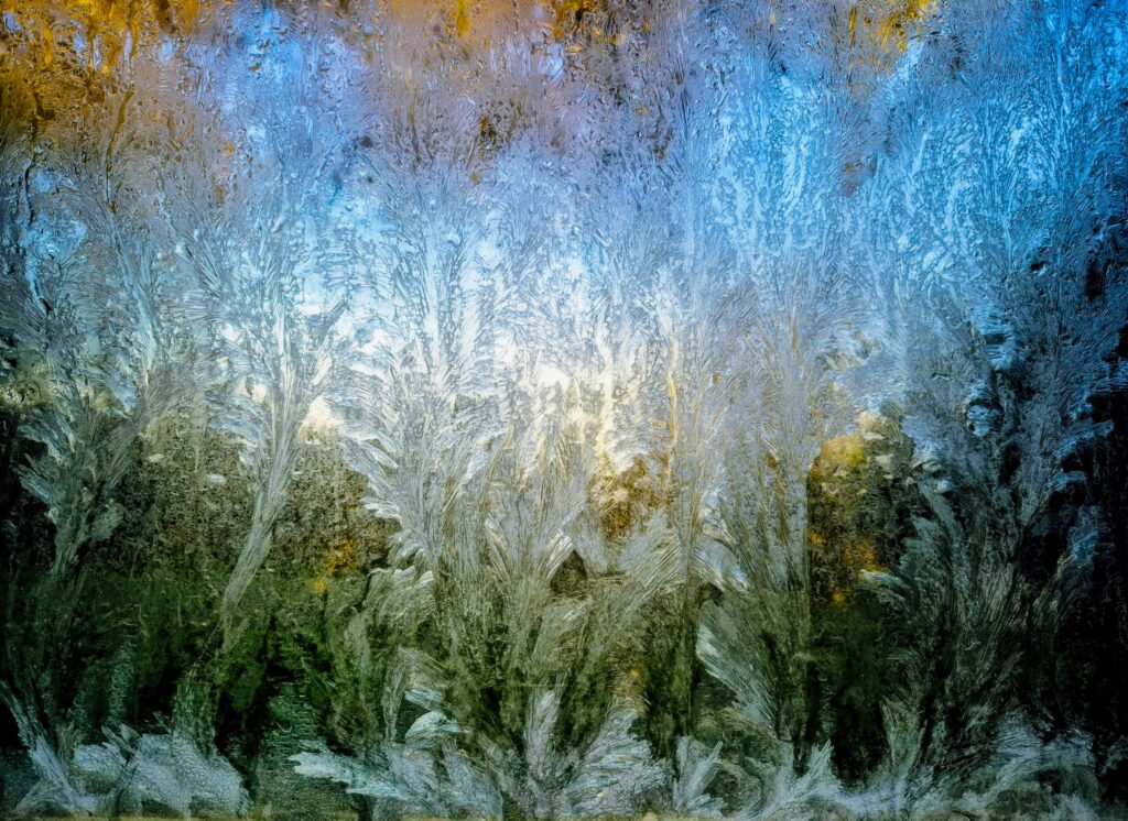 De ijsbloemen hebben op zich al een fraaie structuur, maar de gekozen achtergrond (met het centrale licht) maakt de foto echt bijzonder.