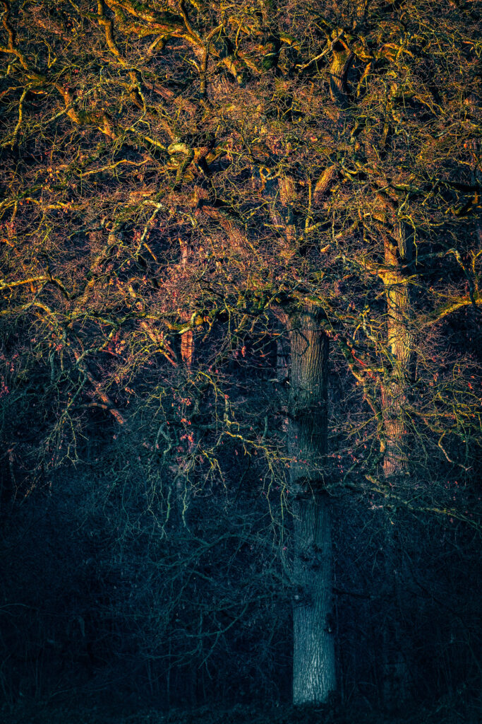 Prachtig, zoals de zon de grillige takkenstructuur belicht. De combinatie koud onder en warm boven werkt heel goed in deze foto.