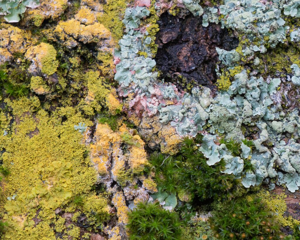 De veelheid aan kleuren en structuren zorgt voor een boeiend ‘abstract schilderij’. De donkere stam (rechtsboven) geeft stevigheid aan de compositie.