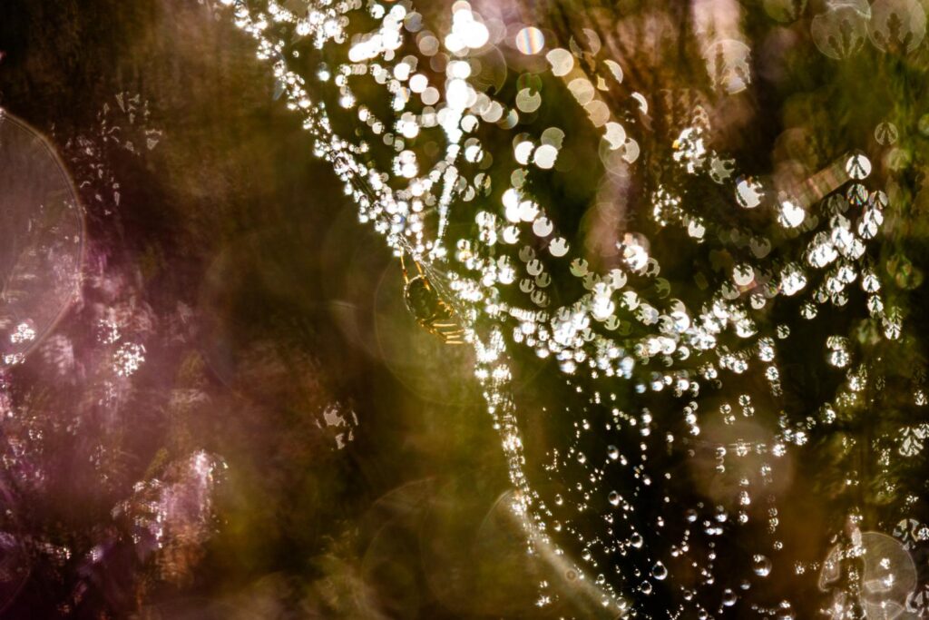 Dit spinnenweb zit vol met dauwdruppels die voor een blingblingeffect zorgen. De struikheide doet goed mee; in de druppels zie je stukjes van de heideplant terug. Het diafragma is bewust iets kleiner gezet, waardoor de druppels parelkettingen vormen. Er is onderbelicht om uitgebeten vlekken te voorkomen. De spin zit precies op de diagonaal in het midden. Dit zorgt voor een dynamische tweedeling van de voor- en achtergrond.