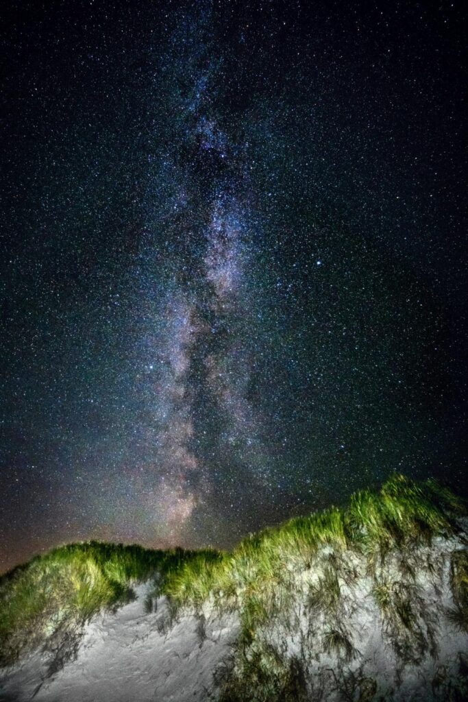 Vanaf het strand van Ameland kun je in heldere zomerse nachten de Melkweg aan de hemel zien staan. Met een duin op de voorgrond houd je de lichtvervuiling van het eiland en het vasteland groten- deels buiten beeld. In de laatste vijf seconden van de belichting is met een zaklamp over het duin geschenen. Op deze manier vormt het duin een levendige voorgrond voor de fonkelende Melkweg.