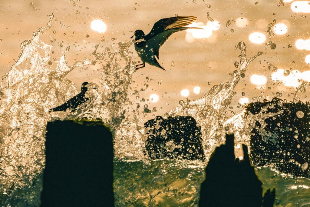 Ondanks harde wind en opspattende golven zoeken deze steenlopers onvermoeibaar op de paalhoofden naar voedsel. Met behulp van een telelens en statief en met een heel korte sluitertijd kun je de vogels in de lucht ‘bevriezen’ en elke waterdruppel zichtbaar maken. Er is flink onderbelicht, zodat in het tegenlicht alleen nog silhouetten zichtbaar zijn. De energie van zon, zee, water en vogels spat van dit zomerse beeld af.