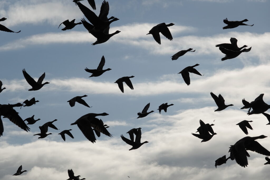 • Een leuke uitdaging: vliegende kolganzen fotograferen. Stel je camera in op continu AF (servo AF) zodat de camera continu scherpstelt. En gebruik een telelens van minimaal 500 millimeter. Werk met korte sluitertijden, 1/1.250 of nog korter. Maak vervolgens heel veel opnames omdat je uiteindelijk veel missers zult hebben (toch niet helemaal scherp en ganzen die half het beeld uitvliegen).