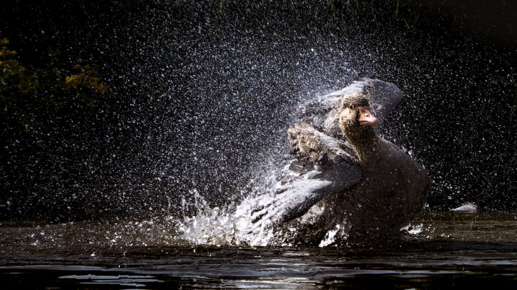 • Een beeldvullende, van top tot teen gefotografeerde gans kan wat saai overkomen. Je kunt dit oplossen door een interessante omgeving op te zoeken, zoals een groep ganzen in een nevelig rivierlandschap.
