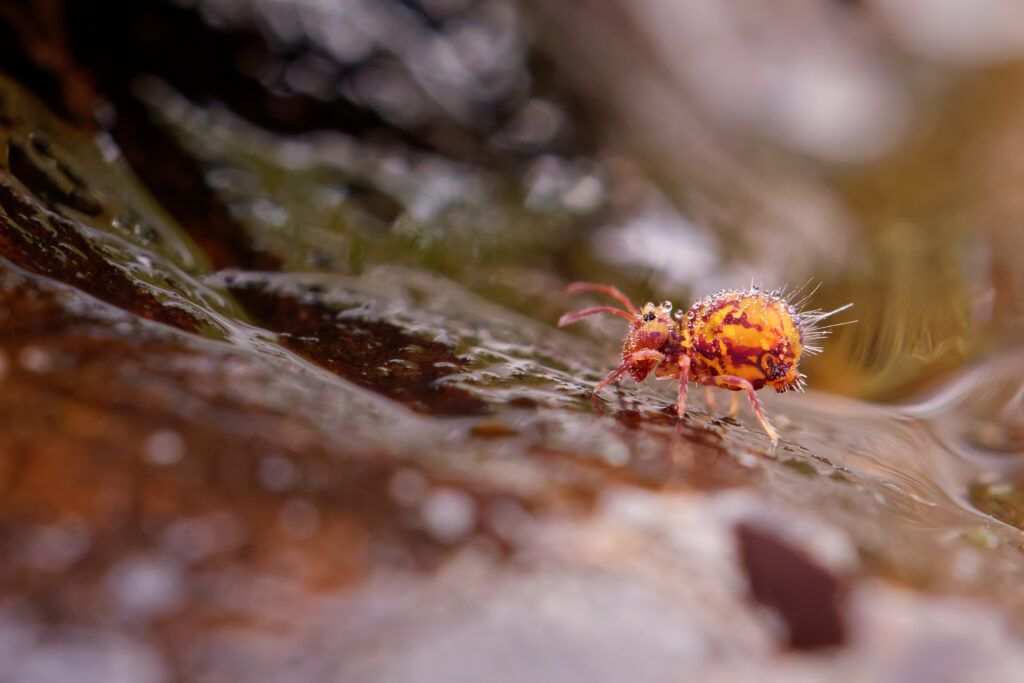 Als je weet hoe klein een springstaartje is (enkele millimeters) kun je nagaan hoe klein de druppels op het lijfje zijn. Perfecte weergave en mooie omgeving.