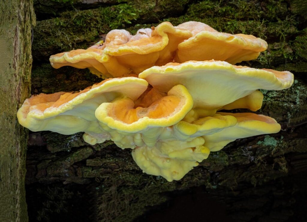 De eerste zwavelzwammen verschijnen in deze periode weer. Je herkent deze reusachtige padden stoelen aan de gele kleur van de vlezige, halfronde hoeden die 40 cm breed kunnen worden. Ze groeien vaak dakpansgewijs boven elkaar en doen soms denken aan ouderwetse fietszadels. De hoeden zijn vaak geplooid en bobbelig, en hebben aan de onder zijde citroengele poriën. Bij verse exemplaren komt daar zelfs gelig sap uit als je erop drukt. Karakteristiek voor deze zwam is de sterke schimmelgeur.