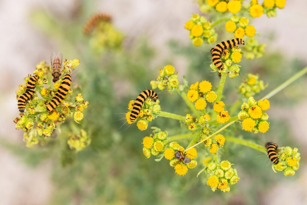 Het jakobskruiskruid komt vooral voor in de duinen en in weiden dicht bij de kust. De samengestelde bloemen staan in een soort scherm. In sommige streken hebben deze bloempjes gele straalbloemen, in andere gebieden zijn het minder opvallende gele hoofdjes. Op deze planten zie je nu de geel-zwart geringde ‘zebrarupsen’ van de sint-jacobsvlinder. Vaak zijn het er zo veel dat ze de planten totaal kaalvreten.