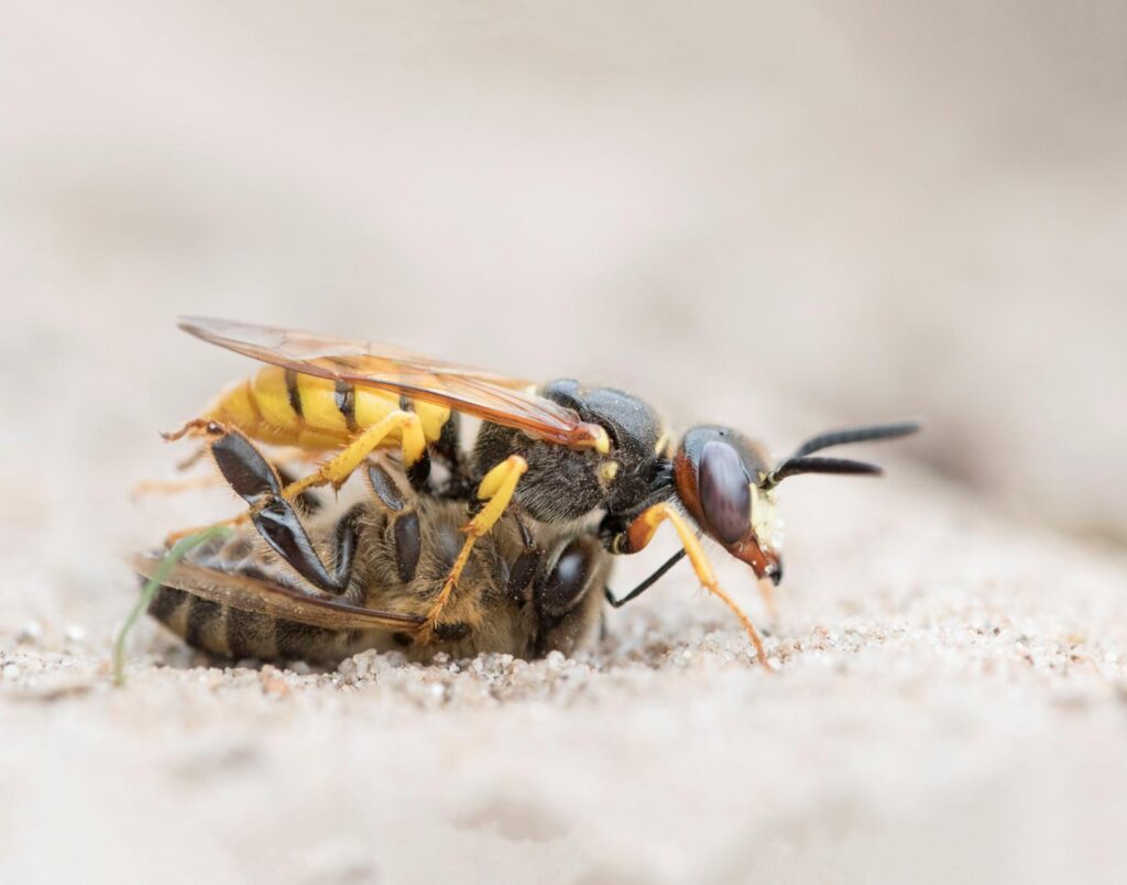 Vergeleken met de kleine goudwespen zijn de gastheren – zoals de bijenwolf – heuse reuzen, die ook nog eens gewapend zijn met een flink stel kaken en gevaarlijke angel. Dat leggen van eitjes in het hol van de leeuw is dus een taak die niet lichtzinnig opgevat moet worden. En wie niet groot en sterk is, moet slim zijn. Groothuis: “Goudwespen zijn inderdaad niet zo weerbaar als hun gastheren en doordat ze zulke juweeltjes zijn, vallen ze ook nog eens behoorlijk op. Ze moeten het dus hebben van ontwijken en verstoppen. Ze hebben vaak grote ogen die ze volgens mij niet alleen voor het vliegen gebruiken, maar ook om goed te spotten wanneer een gastheer even niet bij het nest is. Dan is het tijd om snel een eitje te leggen in het nest van de gastheer.”